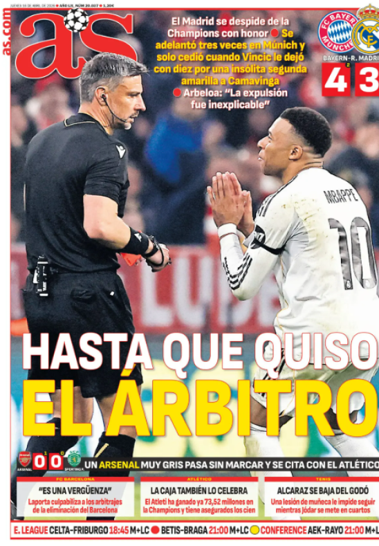 A Madrid non è finita al triplice fischio. L’eliminazione del Real Madrid contro il Bayern Monaco continua nel day after, cambiando solo palcoscenico: dall’Allianz Arena alle prime pagine dei giornali. Lì la partita viene riletta, smontata e soprattutto giudicata. E il verdetto, lato Madrid, è netto: il principale responsabile è l’arbitro Slavko Vinčić. Nel mirino finisce l’episodio dell’86’, quando Eduardo Camavinga riceve il secondo giallo per aver trattenuto il pallone su una punizione dei bavaresi. Una decisione che accende la tensione e cambia l’inerzia della partita: nel giro di pochi minuti arrivano i gol di Luis Díaz e Michael Olise, che ribaltano definitivamente la sfida. La lettura della stampa madrilena è compatta: espulsione eccessiva, episodio decisivo. Marca apre con un eloquente “Che ingiustizia!”, sottolineando come il Real esca “con onore”, ma penalizzato da una decisione arbitrale ritenuta troppo severa. Sulla stessa linea AS, che titola “Finché lo ha voluto l’arbitro”, lasciando intendere che la qualificazione fosse ancora in bilico prima di quel "secondo giallo insolito".