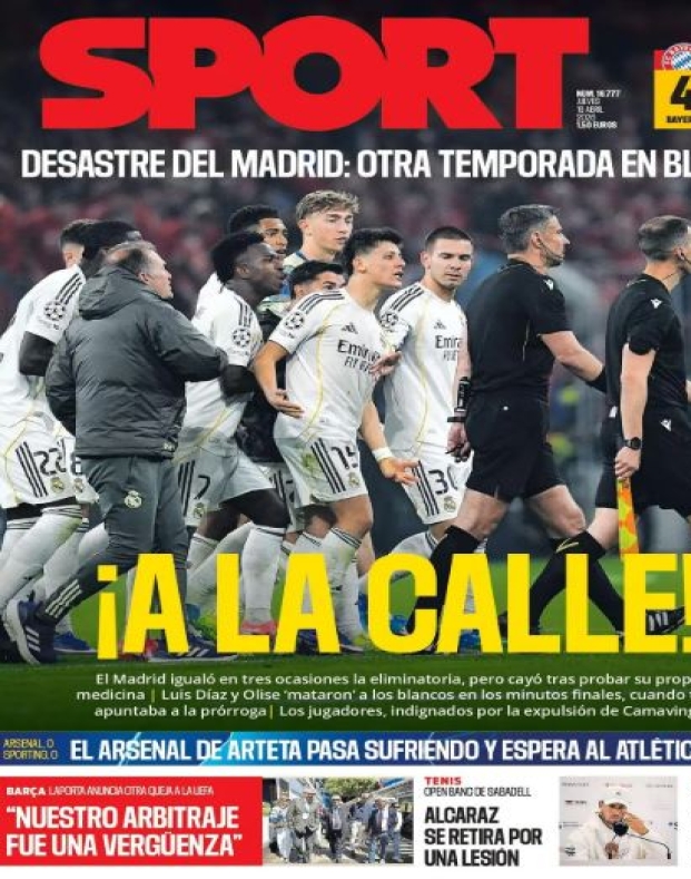 Poi c’è l’altra narrazione, quella che arriva da Barcellona, dove il tono cambia e le polemiche arbitrali passano in secondo piano. I quotidiani vicini ai blaugrana spostano il focus sull’eliminazione del Real e sul bilancio europeo della stagione. Sport va dritto al punto, con toni duri: “Disastro Madrid! Un’altra stagione in bianco”, insistendo sull’idea di un ciclo che, almeno in Europa, non ha mantenuto le aspettative. Più pungente anche la lettura della partita, con il riferimento a un Real capace di andare avanti tre volte contro il Bayern ma poi eliminato, “assaggiando la sua stessa medicina”. Più sobrio invece Mundo Deportivo, che si limita a registrare il risultato e il peso dell’uscita di scena, senza caricare troppo il racconto. Anche perché, dall’altra parte, vista l'eliminazione del Barça con l'Atletico, non c’è molto da celebrare.