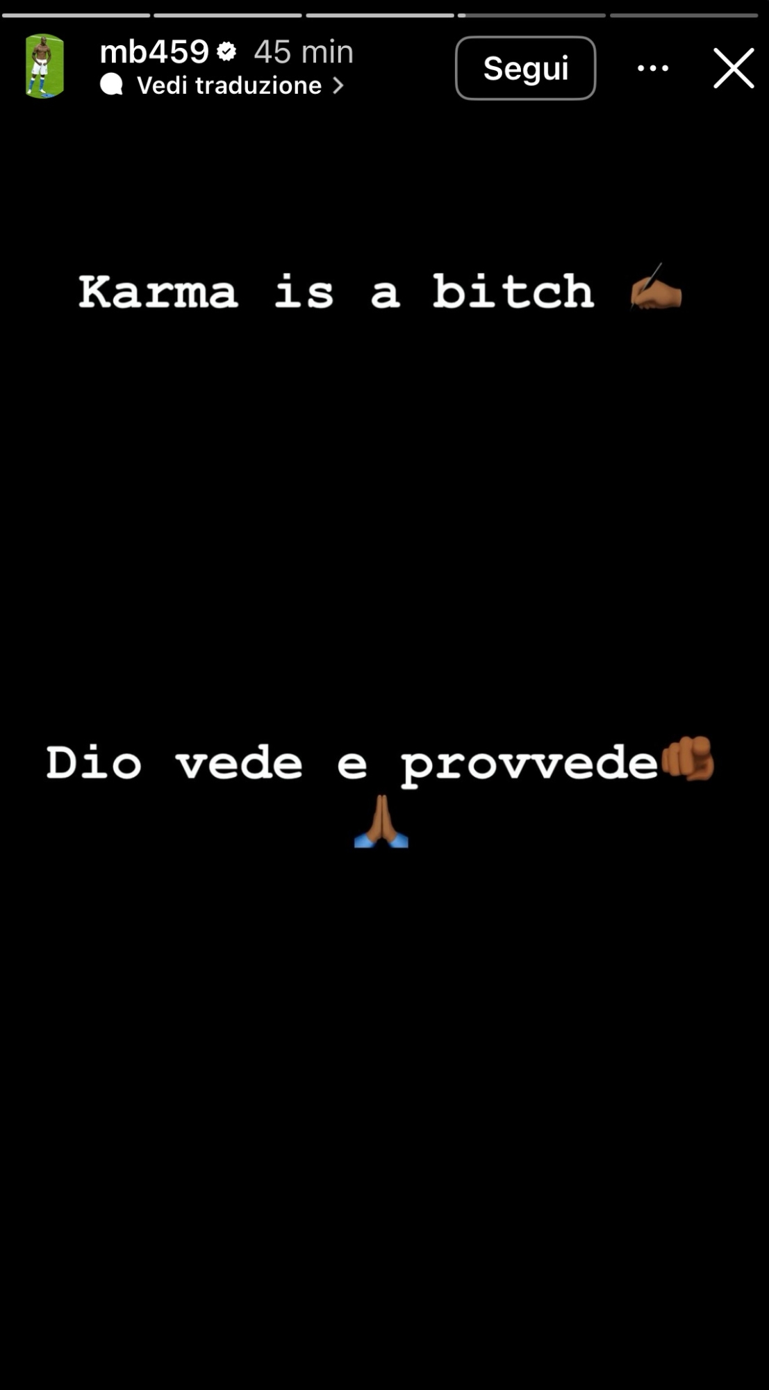 La bordata è pesante. E puntuale. Mario Balotelli, ormai ex attaccante del Genoa, aspettava al varco da tempo un passo falso di Patrick Vieira, che durante la sua parentesi in rossoblù mai lo aveva realmente considerato, tanto da influire profondamente sul definitivo addio di SuperMario al Genoa. "Karma is a bi*ch", esordisce Balotelli nella prima storia postata su Instagram contro l'ex allenatore del Grifone, "Dio vede e provvede".
